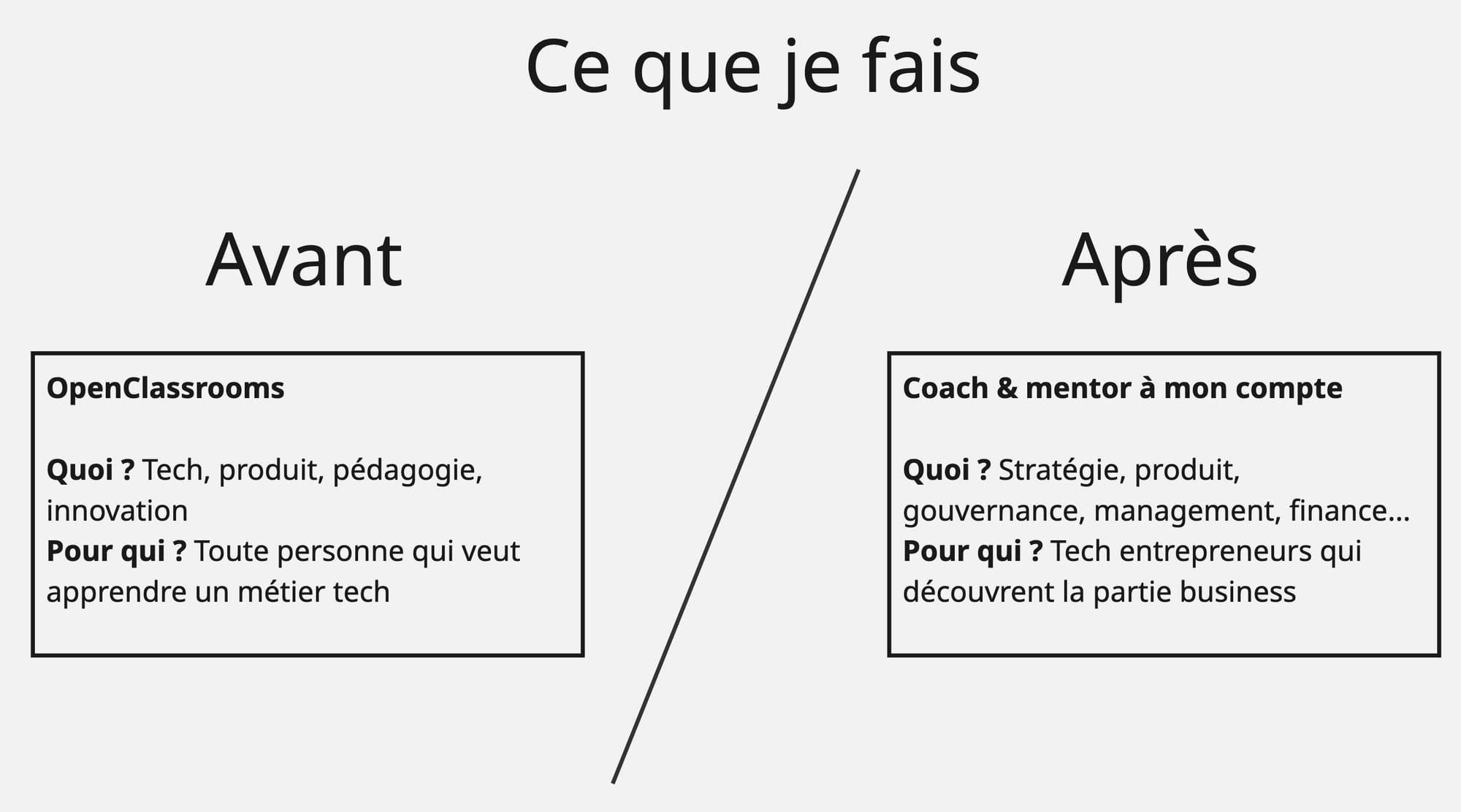 Ne voyant plus comment faire et un peu consumé de l'intérieur, j'ai fait un truc impensable et vertigineux pour moi. J'ai quitté mes fonctions opérationnelles d'OpenClassrooms, tout en gardant un siège au board, au comité de mission et quelques missions de temps en temps.