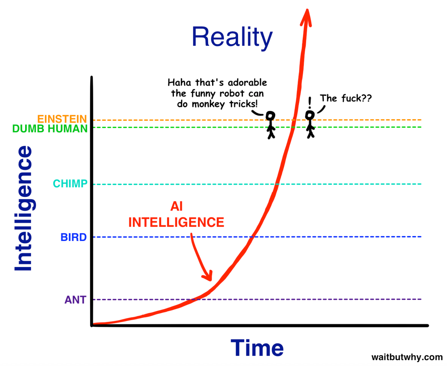 Appliquons ce principe maintenant à l'intelligence artificielle. Un coup elle est à peine capable d'aligner 3 mots et de dessiner un gribouillis, quelques mois plus tard elle se met à écrire une bonne partie du code informatique, dessiner des chefs d'oeuvres en quelques secondes et produire des films quasi dignes d'Hollywood.