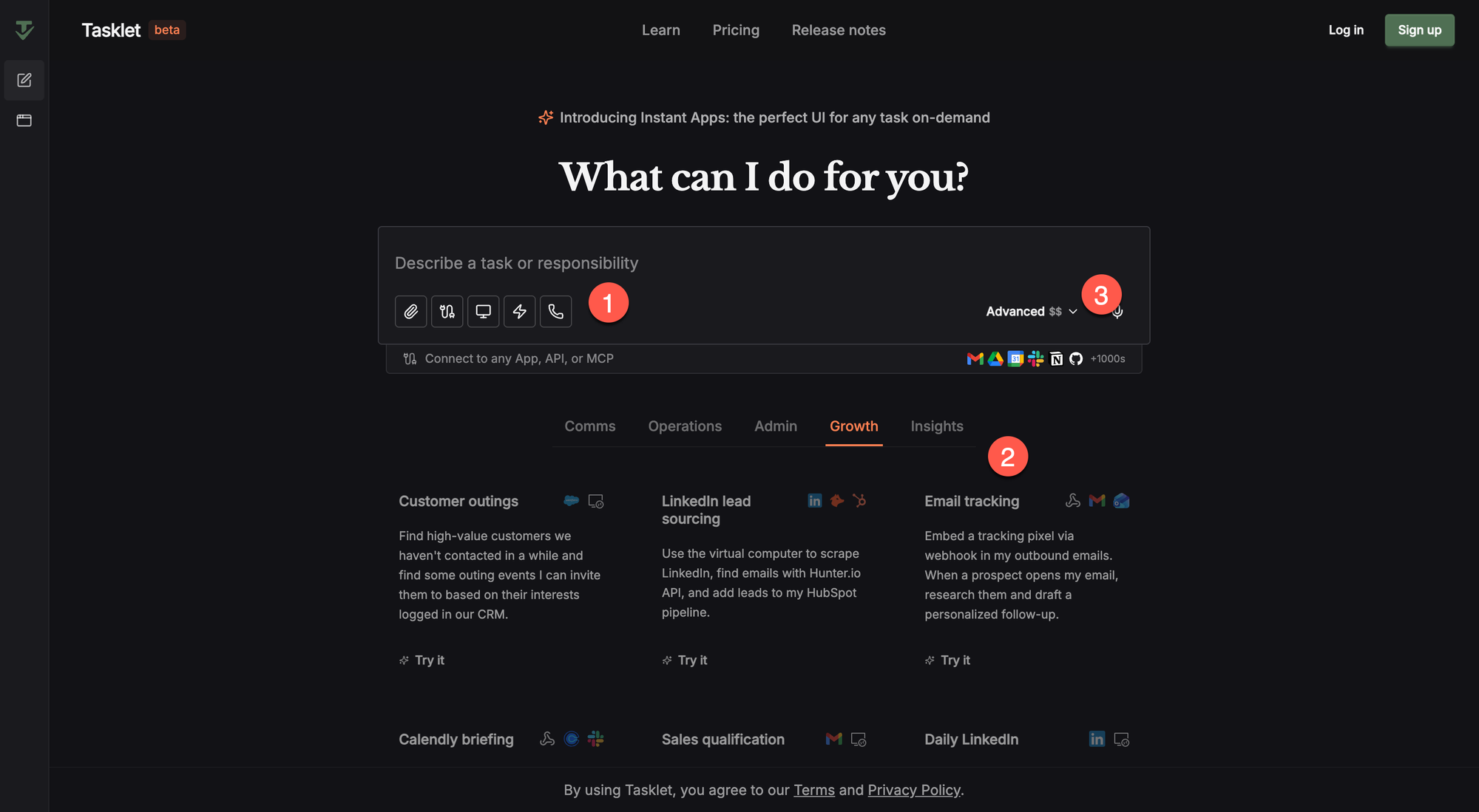 Je vous propose de regarder en particulier ce que j'ai pu faire avec Tasklet, sur lequel j'ai passé le plus de temps ces derniers jours. Quand on arrive sur le site, on croit qu'on est face à un énième chatbot (erreur !) :
