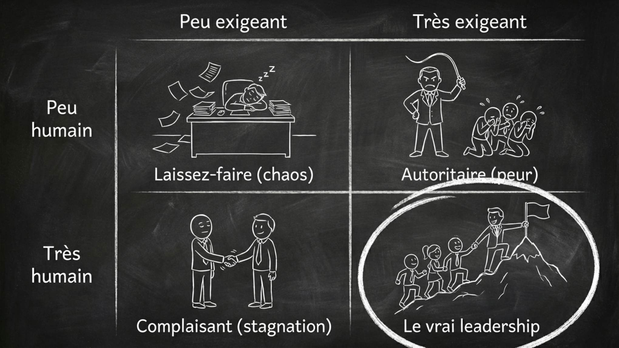 - "Le sympa qui perd" : le patron qui ne sait pas dire non, qui confond gentillesse et permissivité. Tout le monde l'aime, mais rien n'avance.